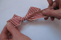 Cut 20 in. of 1-1/4 in. wide striped ribbon and 6 in. elastic cord. Tie the cord ends together with an overhand knot an thread the loop onto the ribbon.